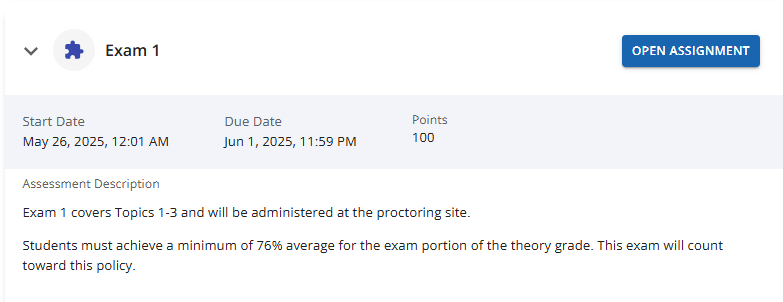 To open an assessment in GCE Tester, first navigate to your Halo classroom and locate the External LTI Assessment linked with GCE Tester. This can be found on your class calendar, syllabus, or gradebook. All External LTI Assessments feature the puzzle piece icon in Halo, as seen below.